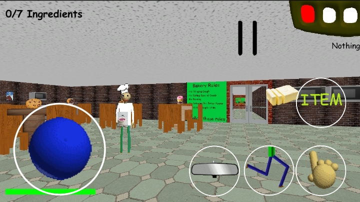You have gone to Baldi's Bakery to help him make a cake for the birthday party! But, when you got there, baldi lost all the baking ingredients! Now you have to go around his bakery and find the missing ingredients so he can finally make the cake with you at his house.
